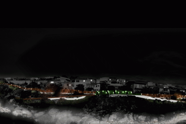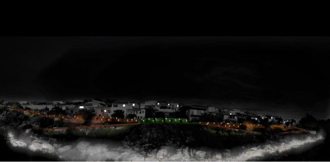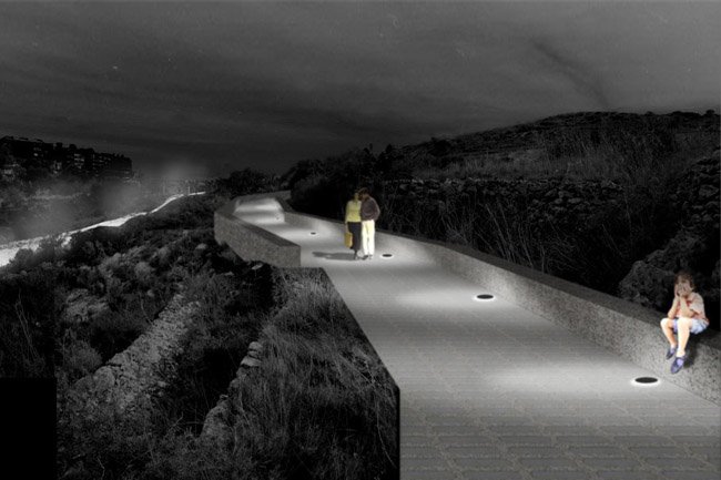 ARTIFICIAL-LIGERO. Una pasarela se apoya puntualmente sobre el territorio o sobre un nuevo muro que construye el lÃmite entre las parcelas y el cauce (en la primera parte de este recorrido). Será una pasarela porosa que permita ver y mantener el suelo bajo ella intacto. Se hará un desbroce selectivo de la vegetación colocando la intervención a modo de PIERCING sobre el territorio. Fuera de la ciudad la iluminación del pueblo cobra importancia, es un lugar donde mirar. La iluminación será baja y rasante para evitar el deslumbramiento del paseante .