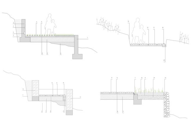 NATURAL-PESADO. Se mantiene la textura existente en la zona, solo una senda operativa trazada con el material del rÃo establece el recorrido. Una actuación tectónica a base de hormigones, consolidación de los muros de las terrazas existentes y el fresado de la piedra.