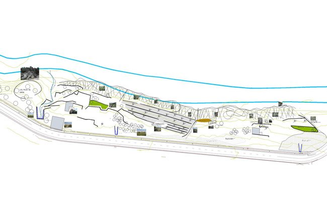 o, no hace falta introducir un nuevo programa que lo complemente, UNA ZONA PARA SER RECORRIDA. El programa será el paseo y las zonas estanciales. La inventiva personal será para interpretar las formaciones geológicas, la toponimia existente de la zona o la creación de nuevos nombres de las cosas. Un lugar donde explicar, donde documentar el recorrido para aquel que le interese. Explicar la historia (la relación con el reino de tifas de Denia, la reconquista, ), pero también la historia no-escrita (las tradiciones y la leyendas de la zona), el territorio (el rÃo Gorgos origen de todo el proyecto, ), y los sistemas de cultivos (la vid, la uva, el vino y la pasa), en definitiva también un AMPLIFICAR DE LA MEMORIA.