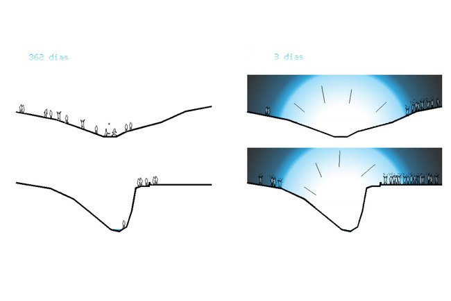 2b. La infraestructura de la ciudad se posa sobre el territorio superior al cauce, sobre la cima del acantilado y permite recorrerlo y acceder a las distintas zonas. Nos posamos sobre el suelo como harÃa un insecto, delicadamente con apoyos puntuales.