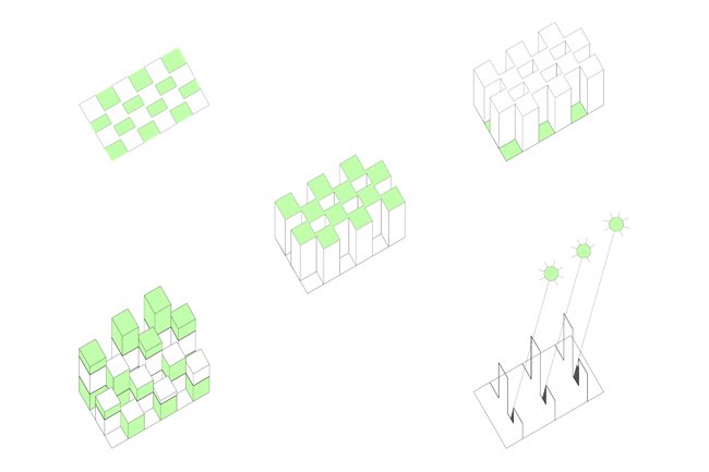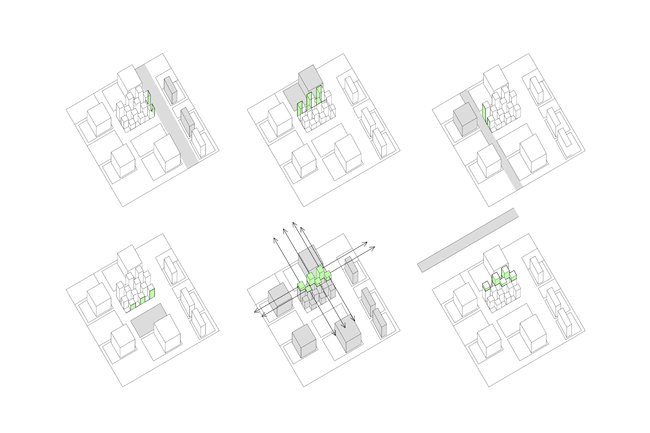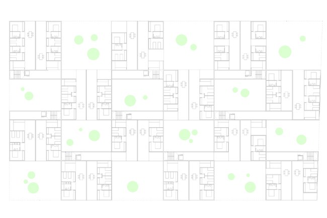 4.DISPOSICIÓN: todas las viviendas siguen el patrón A+B, por lo que se disponen de manera tal que viertan simultáneamente a calle e interior verde para cualificar, del mismo modo, sus salas interiores.