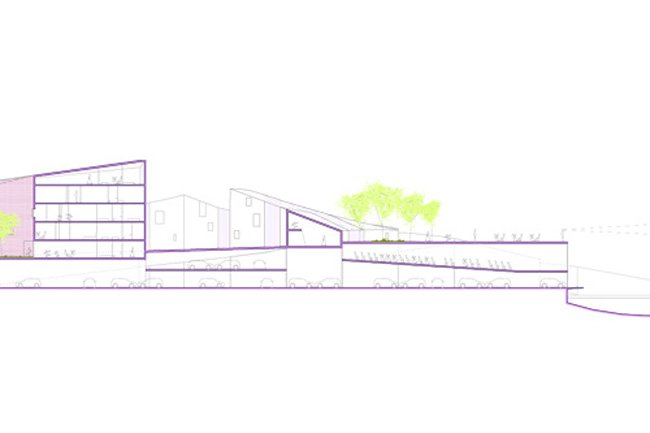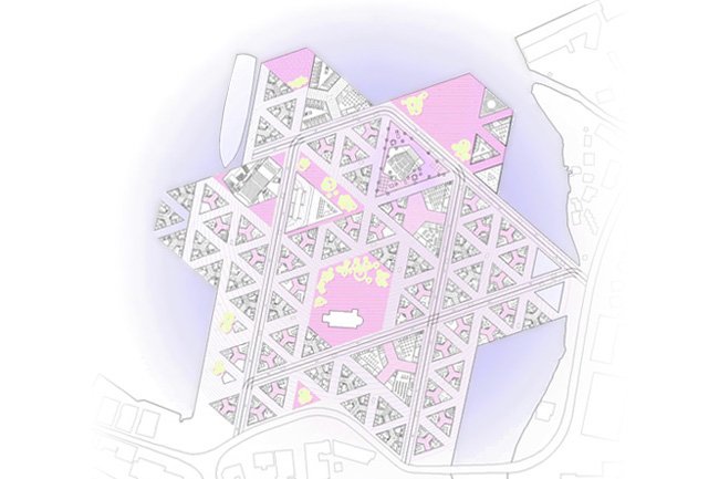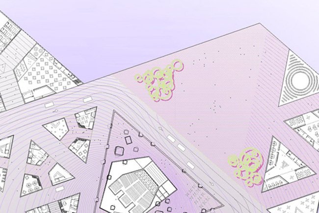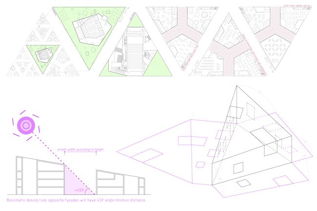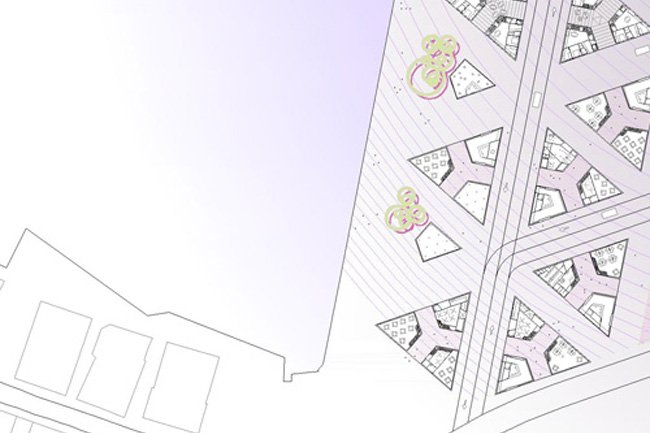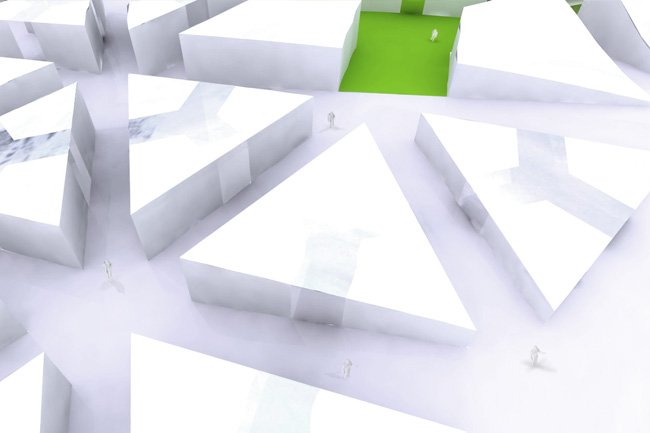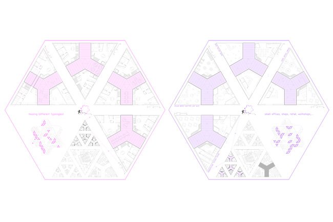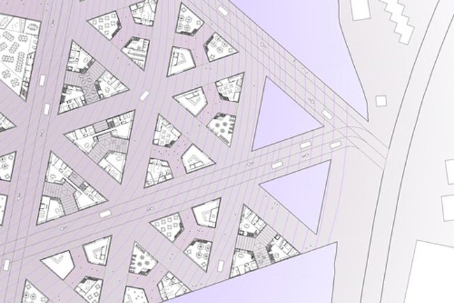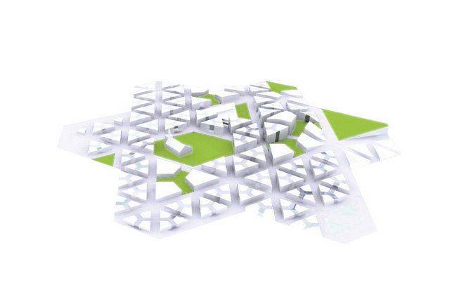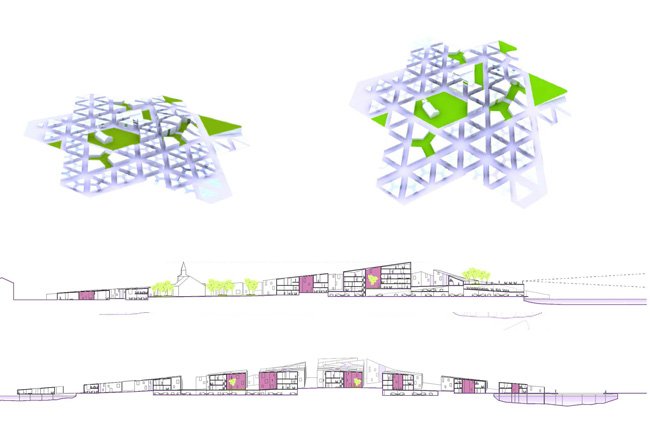 is based on a spearhead. As a hardanger tissue, this geometry allow us to sew a new urban complex system. Both housing and building are drawn like the new city.