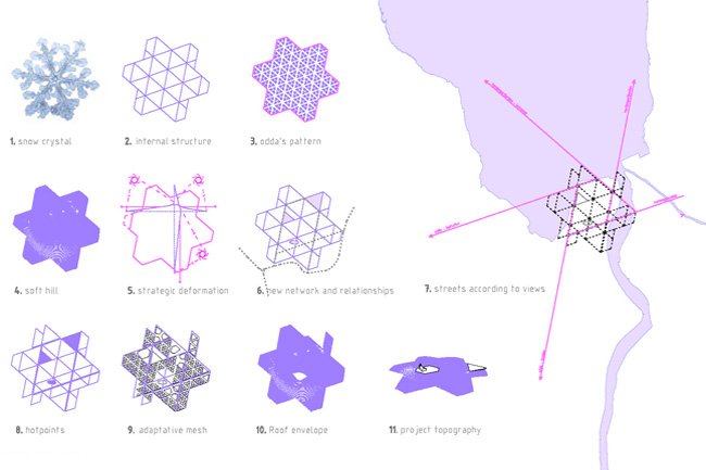 Una estrella de 6 puntas, fruto del trabajo de la trama urbana a modo de ‘hardanger’ noruego, es la forma elegida; una formación presente tanto en el mundo natural como en la historia de las ciudades europeas. (estrella hielo, palmanova)