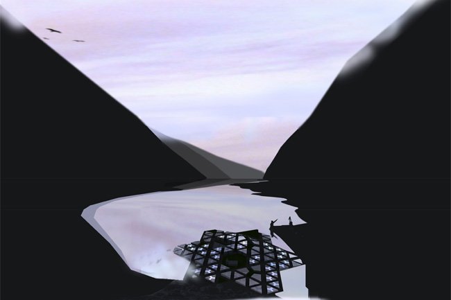 FROM OUTSIDE. The first strategy is to deliberately build up a new elevation for the centre like a slight bump over the landscape or like a fjord inverse reflection. A new soft topography, in the centre of the valley, generates its own image by comparison to the steep mountains and the flat fjord. This would be a new intelligent hill, offering its southe