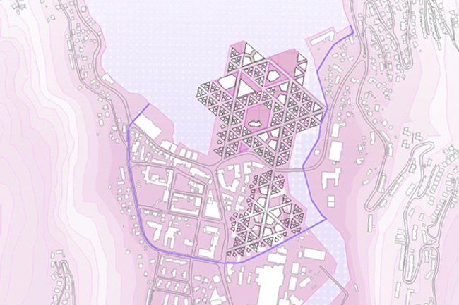 a) Its tips link different points of the city which have been unlinked so far, crossing both the main road and the river. It brings the city close to the fjord as well as the industrial area, reconnecting the centre and rising over the city in order to enable the new Odda’s public space to come up. The star forms the centre, the new meeting point for both inhabitants and visitors.
