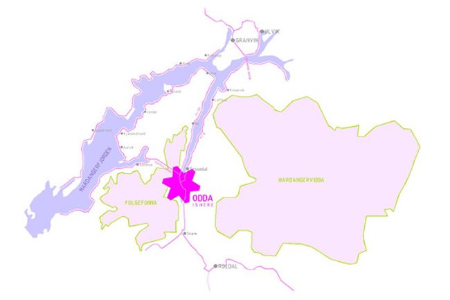 Si entendemos que el 90% de la región se sitúa a 600m sobre el nivel del mar, enseguida entenderemos la importancia de trascender la propuesta urbana a la quinta fachada. Esto nos lleva a entender el nuevo centro no sólo como un referente en la cotidianidad de sus habitantes a nivel del mar sino como un referente a escala territorial. Marcaremos Odda en el territorio. (plano situación fiordo)