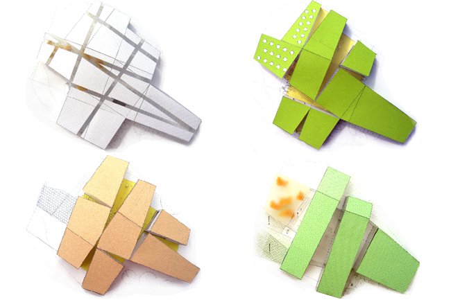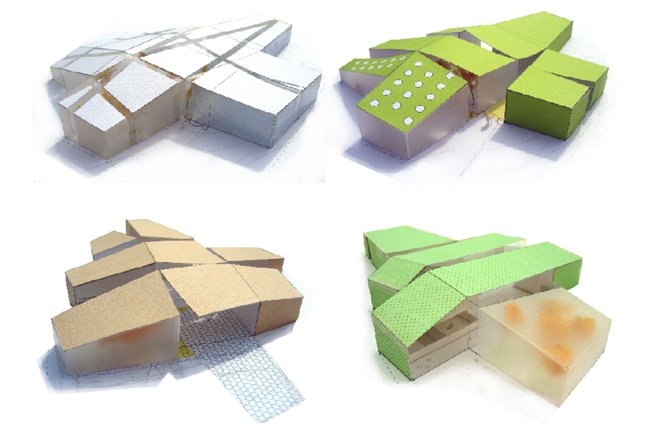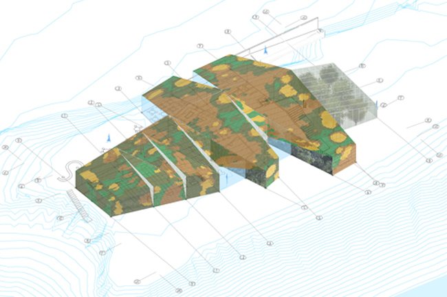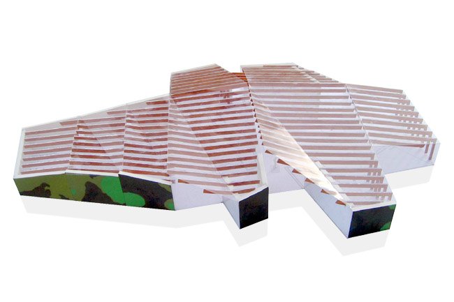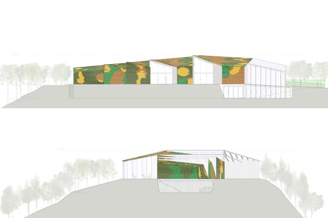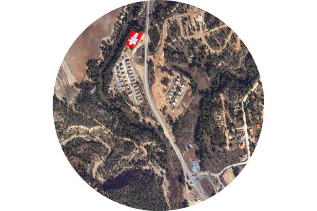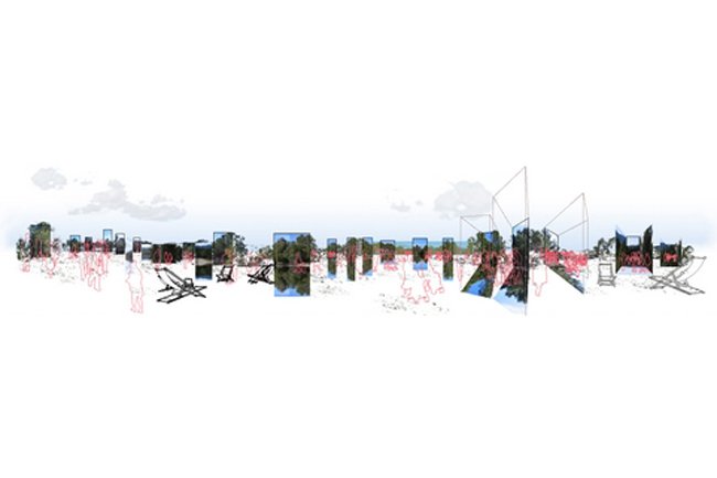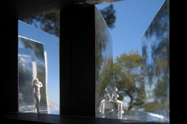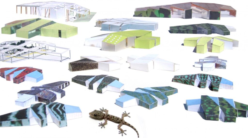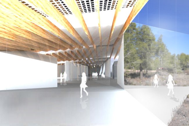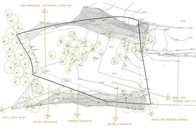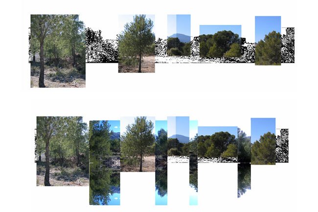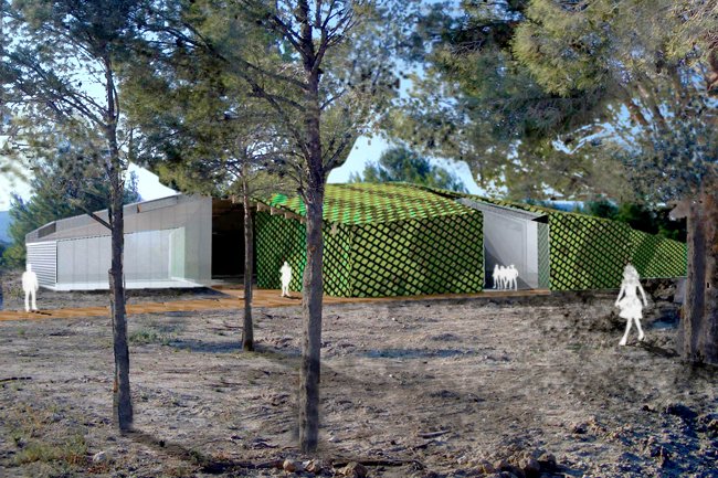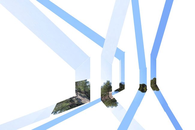 Nosotros empezamos a hablar de la amplificación del paisaje, por lo que las tiendas se disponen para dejar ver fragmentos de bosque entre ellas, construyendo sus cerramientos con materiales de distintos grados de reflexión / refracción. Estos amplificadores replicas de relojes insertan imágenes de distintos puntos del paisaje simultáneamente dentro del interior, de la misma manera que permite una prolongación «natural» del centro hacia el bosque de pinos mediterráneos que identifica el lugar. Así forma sus patas.