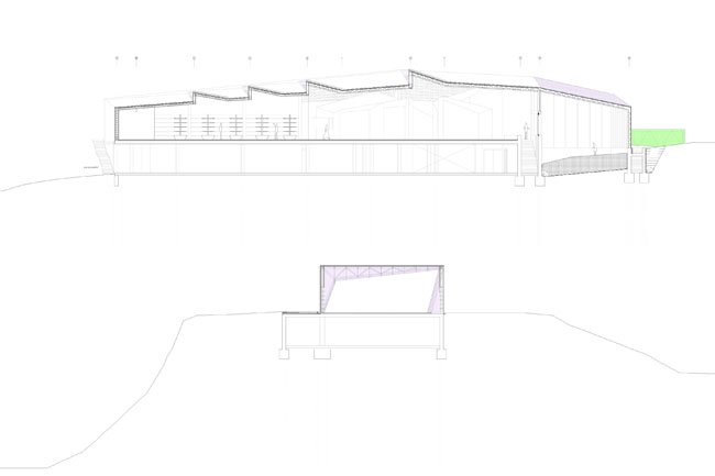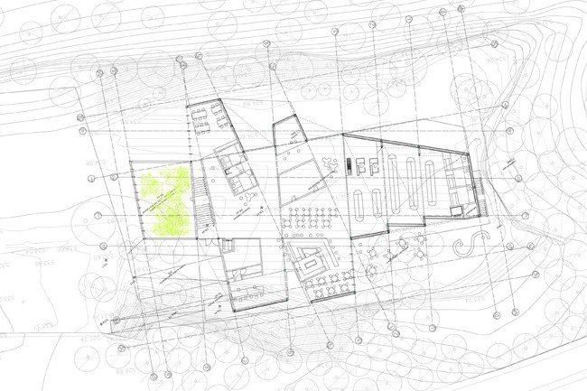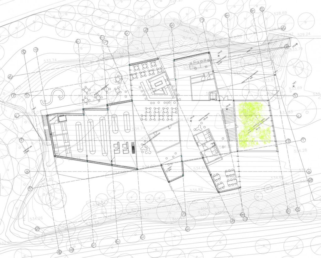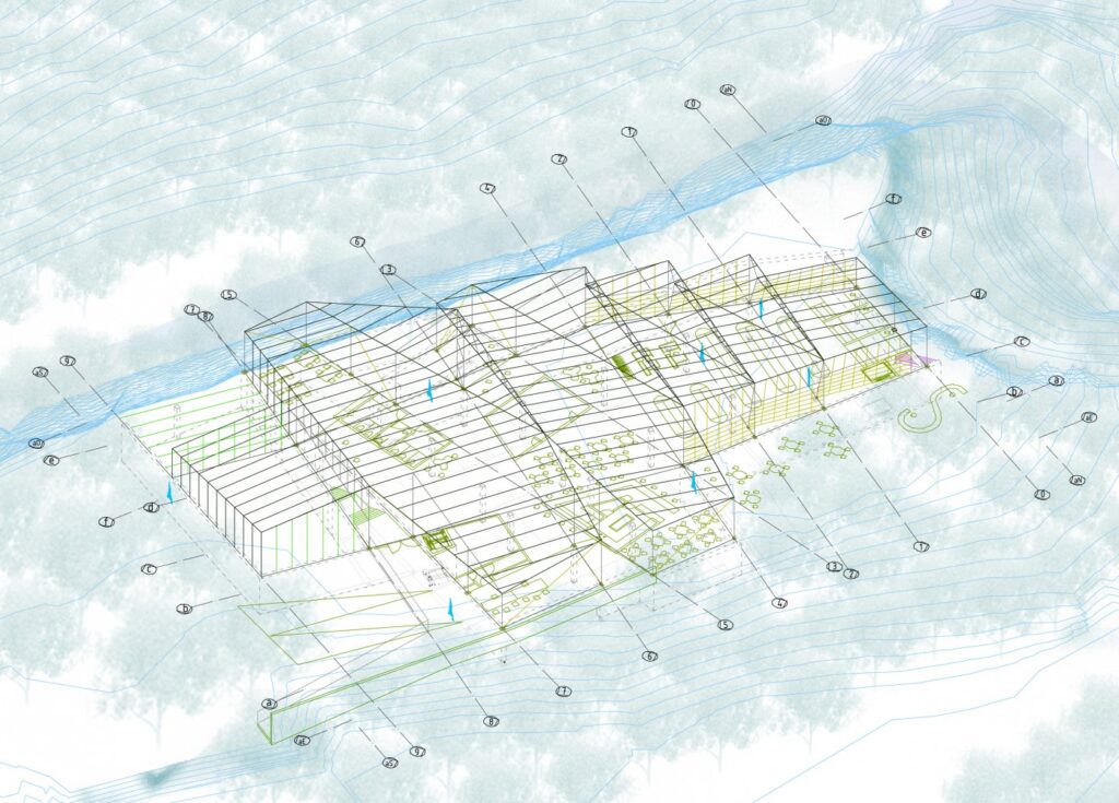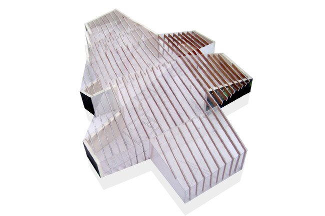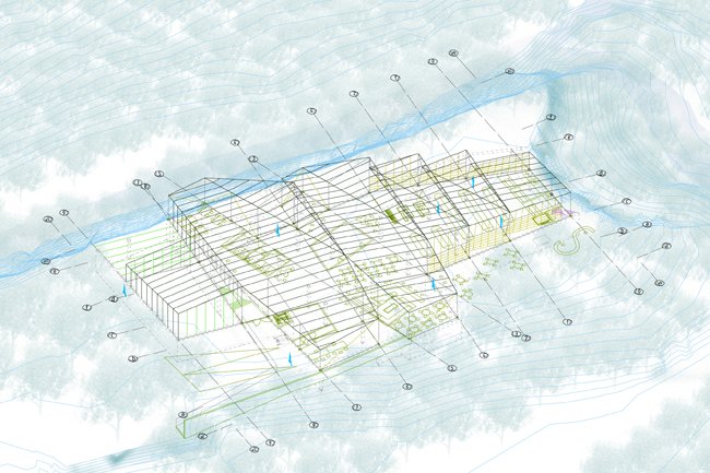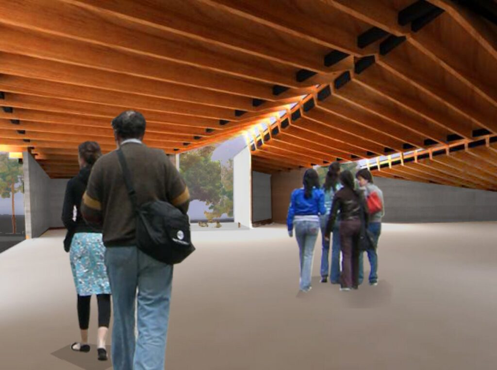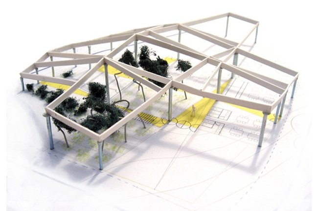 Los dibujos previos «in situ» de hojas de pino construyen tanto la planta como su sistema estructural. La estrategia es clara, pasar de un borde a otro de la manera más liviana posible generando un paisaje interior más propio de los mercados de abastos que del «mall» americano. Así forma su cuerpo.