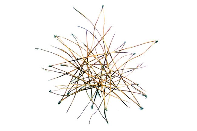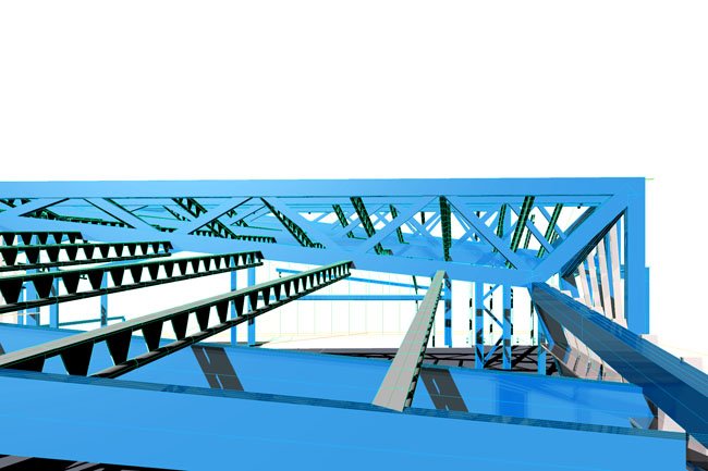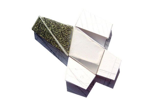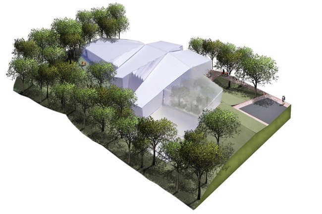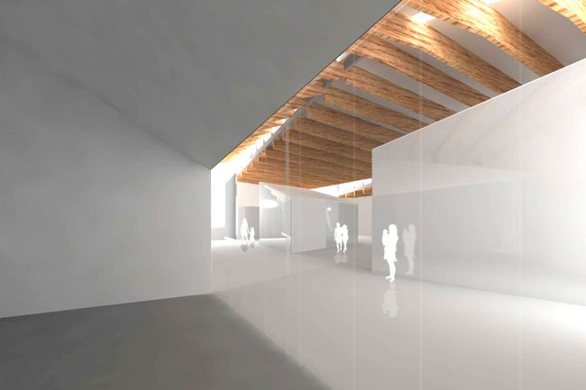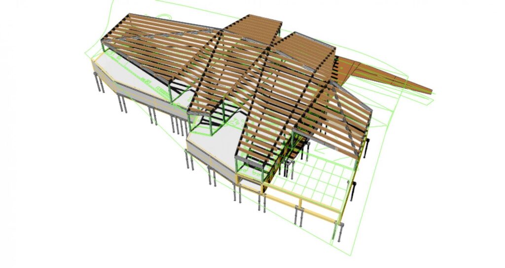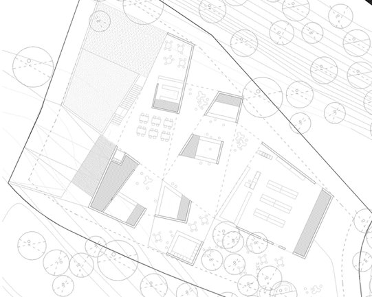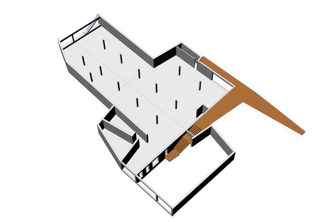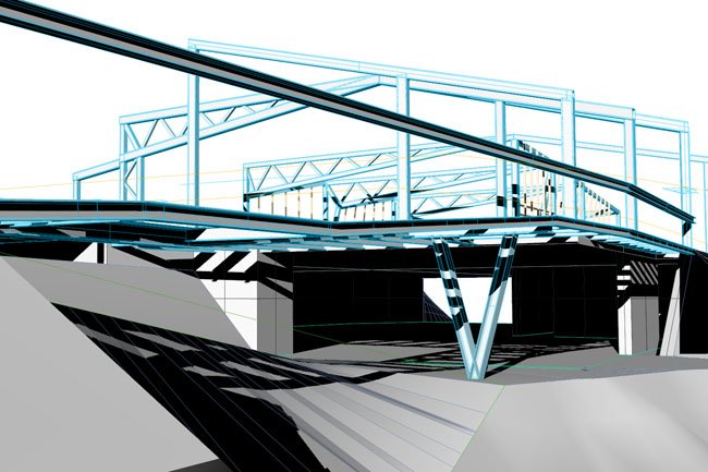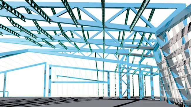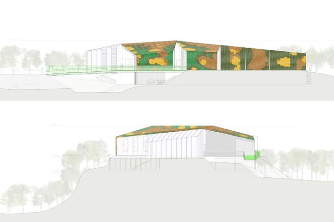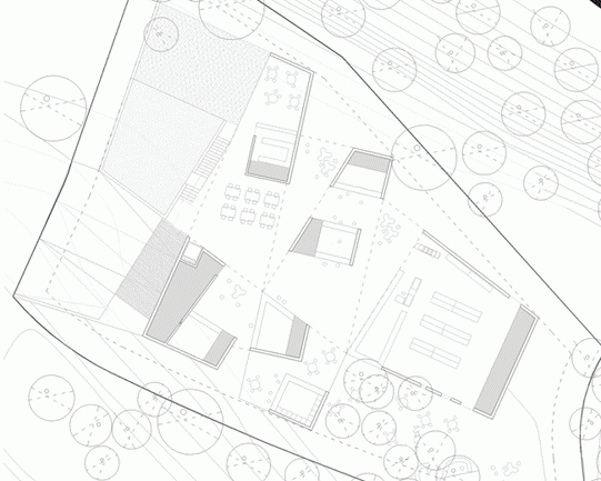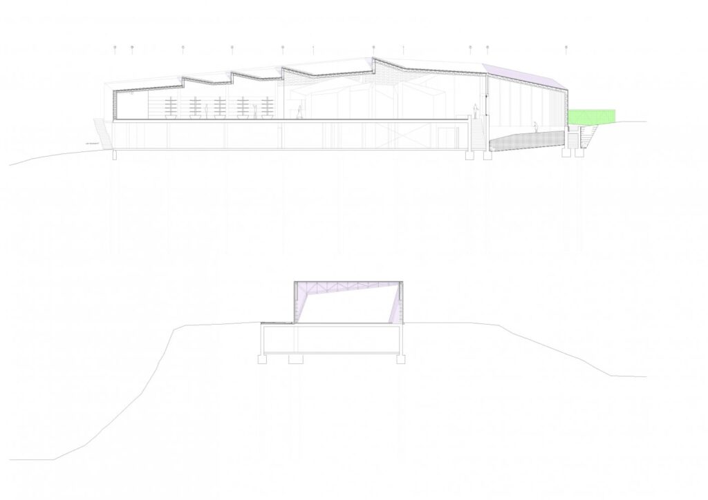 Los dibujos previos «in situ» de hojas de pino construyen tanto la planta como su sistema estructural. La estrategia es clara, pasar de un borde a otro de la manera más liviana posible generando un paisaje interior más propio de los mercados de abastos que del «mall» americano. Así forma su cuerpo.