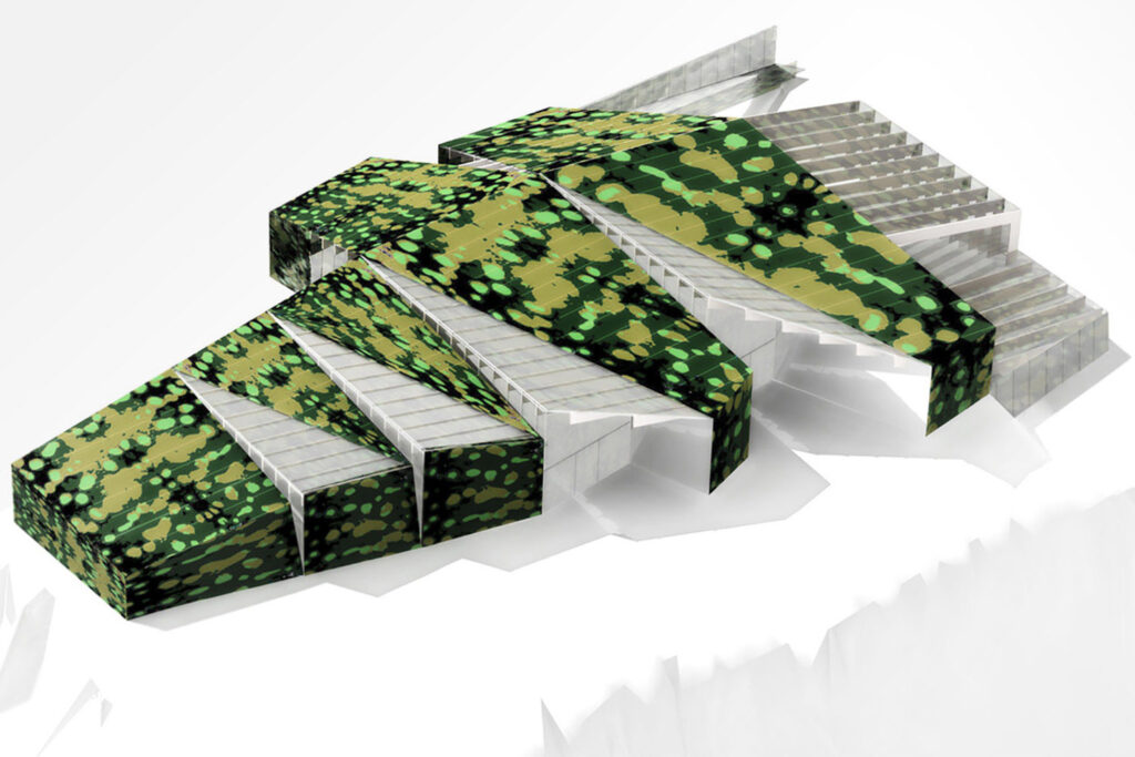 Por último, placas asfálticas policromáticas y algunas protuberancias fotovoltaicas generan un paisaje extraño pero familiar. Así forma su piel.
